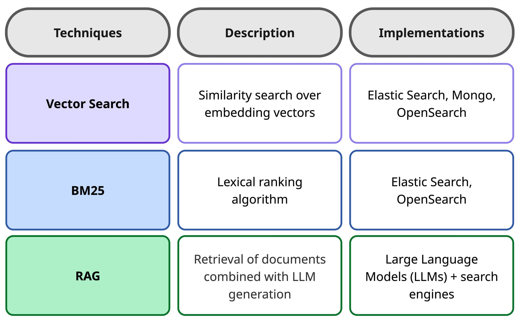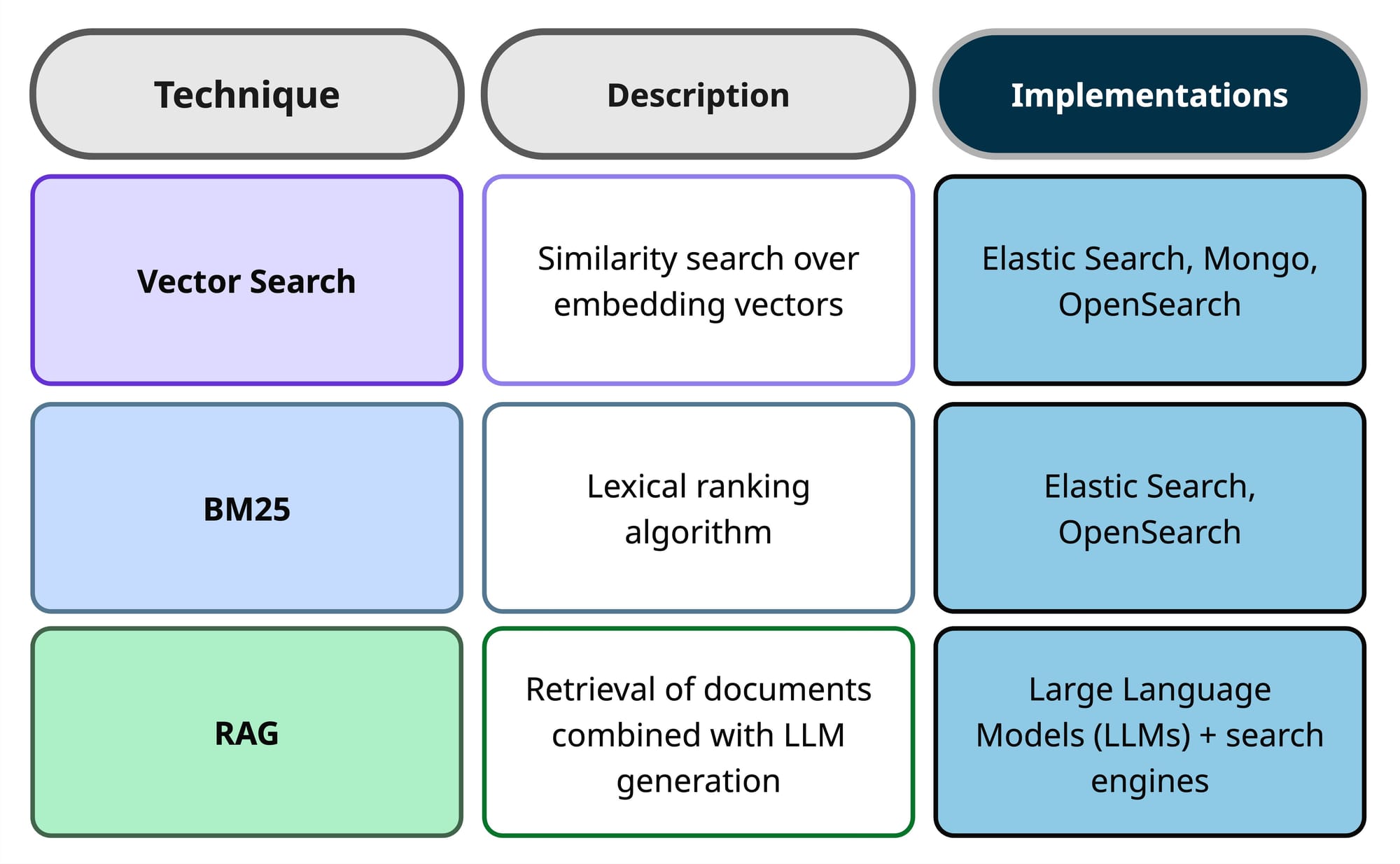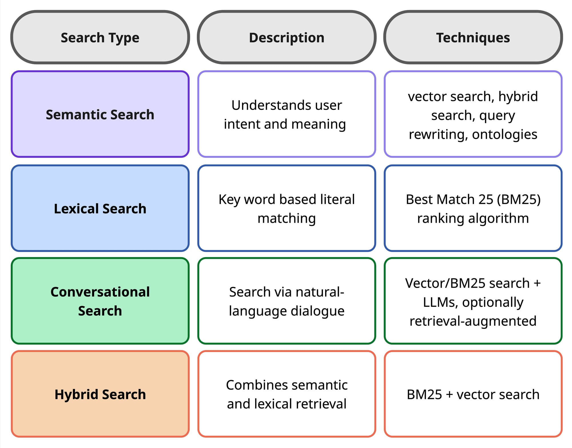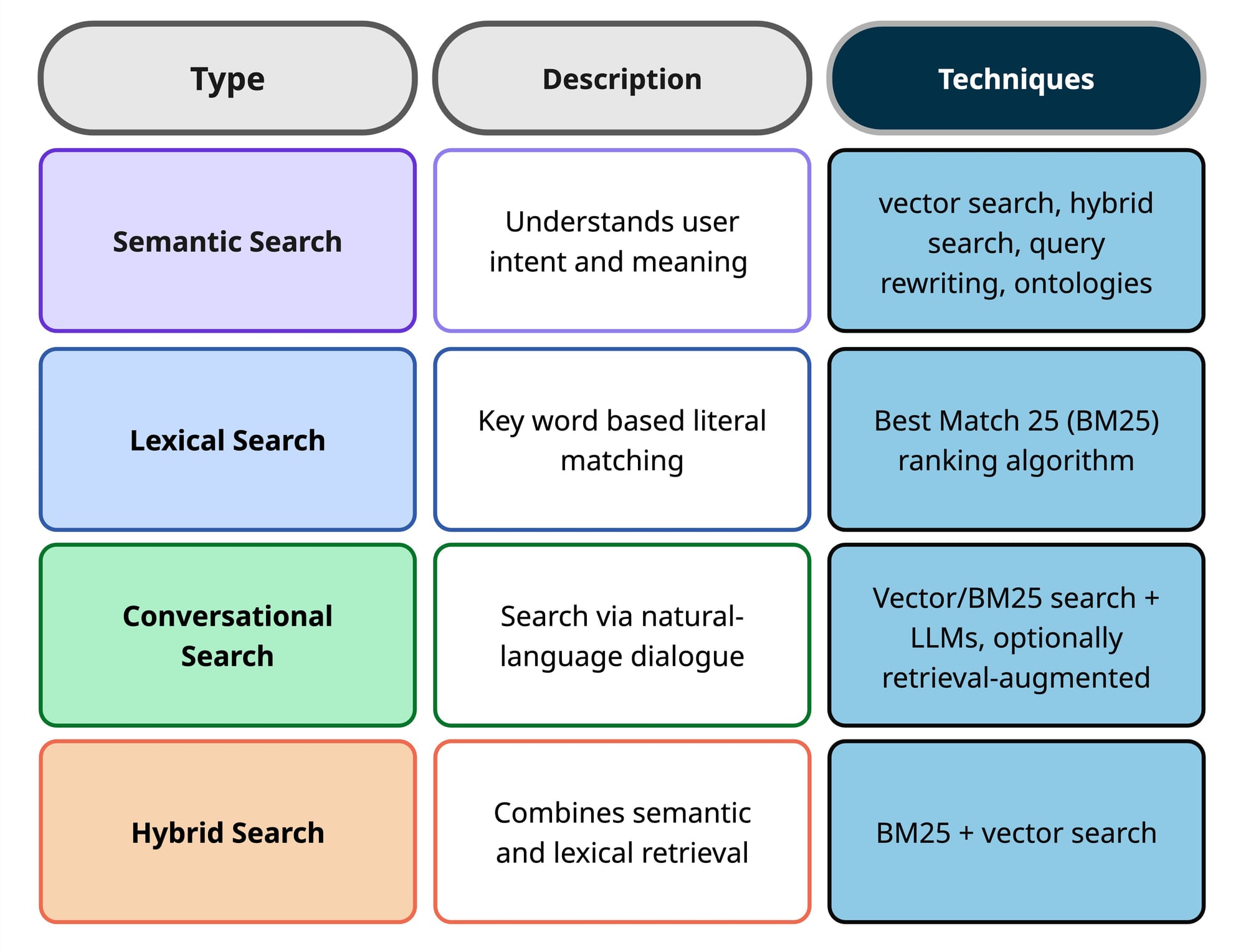 I won’t go deep into details or trade-offs. Instead, I want to provide a broad mental model that helps you reason about different search types and tools, and then decide where to go deeper depending on your needs.