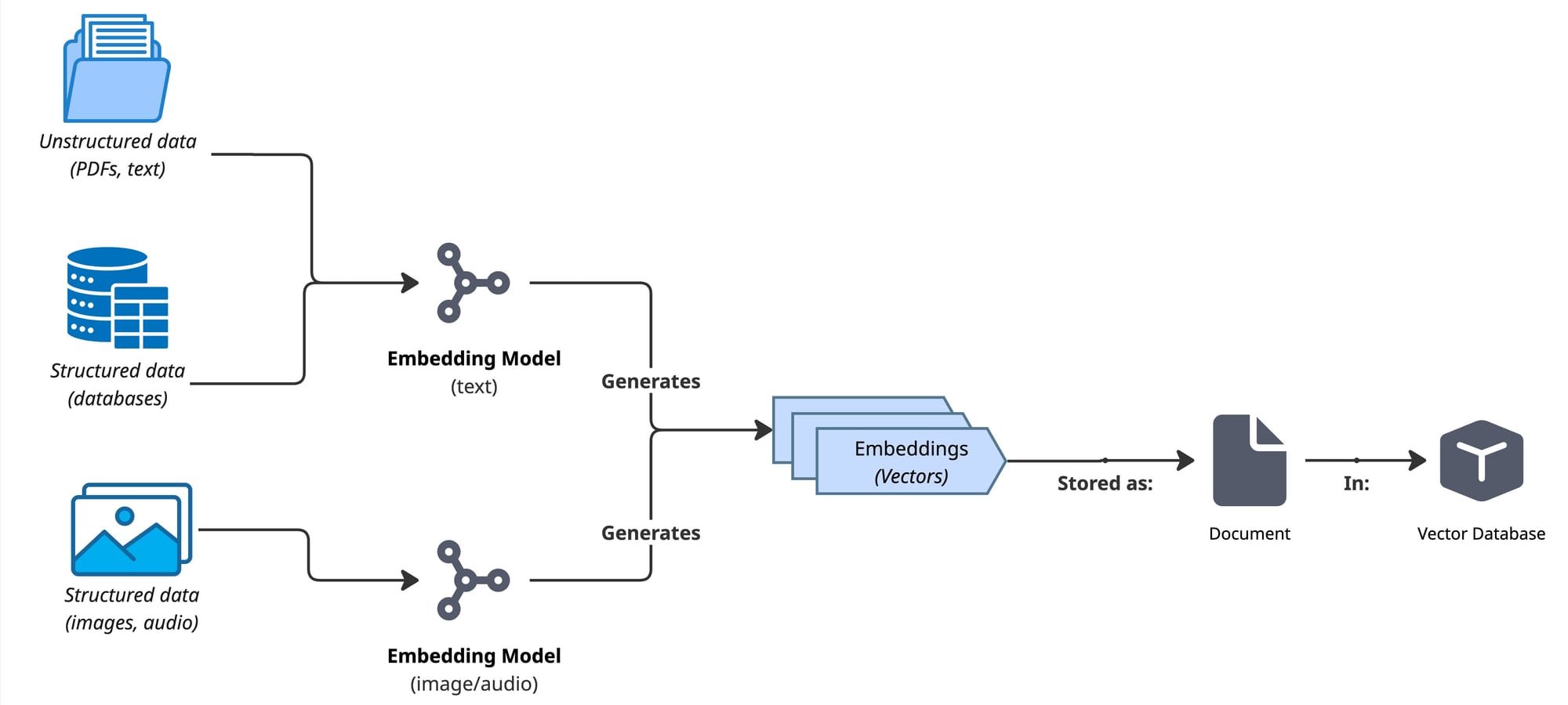 In this phase the goal is to take all the data that we have available for searching, whether is structured or unstructured and create embeddings (vectors with meaning) and stored them in a database that supports storing these vectors.