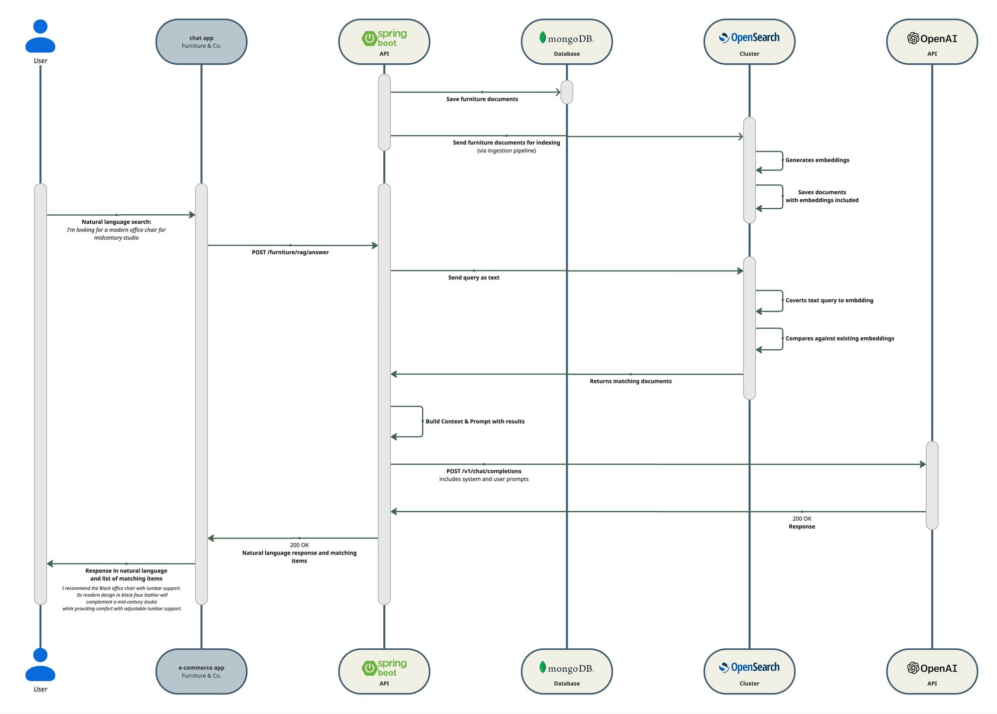 An online store that sells furniture and home accessories wants to offer a chat-based search experience where users can ask natural language questions like “What’s a comfy sofa for a small living room?” and receive a direct, conversational answer grounded in the store’s actual product catalog.