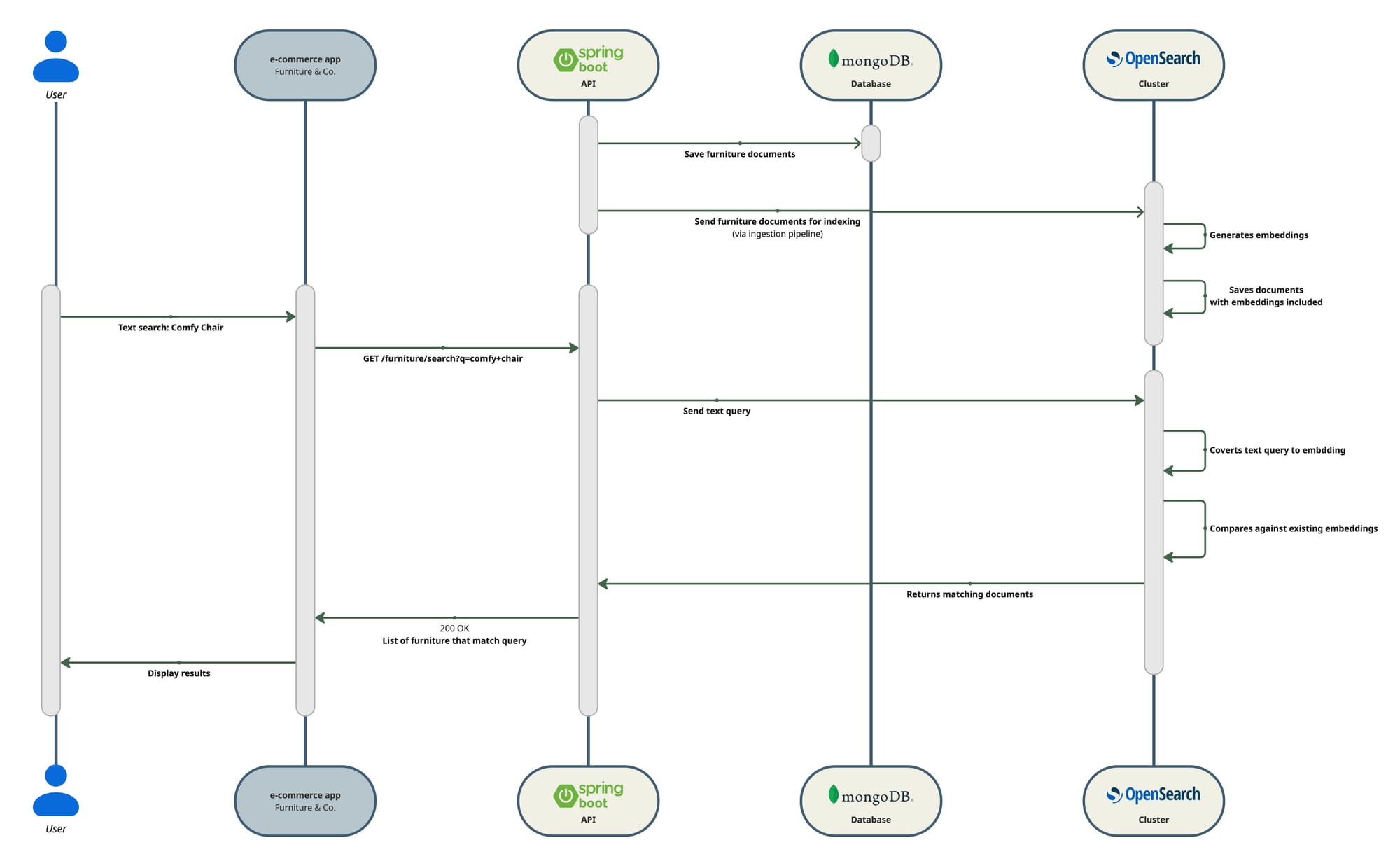 | OpenSearch | Generates embeddings and indexes furniture data for search. |